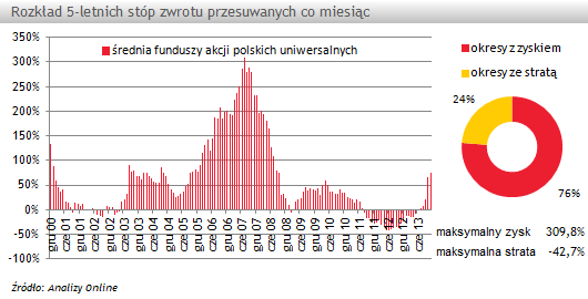 W sumie na 156 przesuwanych co miesiąc 5-letnich inwestycji w przeciętny fundusz akcji polskich uniwersalnych, w 76% przypadków kończyła się ona dodatnią stopą zwrotu.