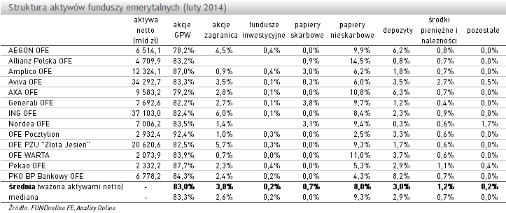 Przekazanie przez OFE do ZUS na początku lutego części aktywów, głównie w postaci obligacji Skarbu Państwa, całkowicie zmieniło strukturę ich lokat. Według danych na koniec lutego średnio 83% środków otwartych funduszy emerytalnych zostało ulokowane w akcjach spółek notowanych na rodzimym rynku regulowanym, a kolejne 3,8% to akcje spółek notowanych poza Polską. Tych drugich nie znajdziemy jedynie w portfelu Allianz Polska OFE, który pozostaje jednym z 3 funduszy o najniższej alokacji w akcjach (83,2%). Pozostałe 2 to AEGON OFE oraz AXA OFE. Co ciekawe, żaden z funduszy nie zszedł z udziałem akcji poniżej 82%. Liderem pod tym względem jest OFE Pocztylion, w przypadku którego łączne zaangażowanie na rynku akcji to 93,4%.