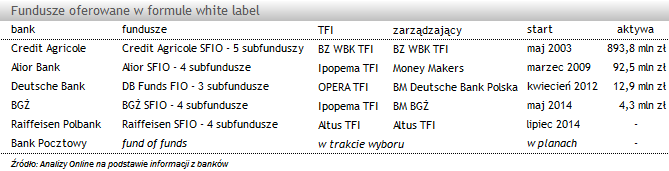 Banki, które nie mają własnego TFI w grupie kapitałowej, poza dystrybucją funduszy „obcych” TFI coraz częściej decydują się na zaoferowanie własnych funduszy. Do współpracy wybierają wówczas jedno z ponad 50 działających towarzystw. Ostatnio o takich planach poinformował Bank Pocztowy oraz Raiffeisen Polbank.