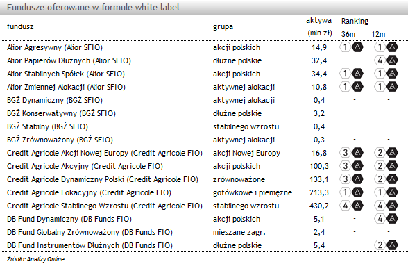 Nie zawsze jednak banki decydujące się na działanie w formule white label wybierają konstrukcję FoF-ów. Dla przykładu, pierwszy bank działający w tej formule - Lukas Bank (obecnie Credit Agricole) zdecydował się na klasyczne rozwiązania, których aktywa lokowane są bezpośrednio na rynku kapitałowym. Partnerem przy obsłudze, a także zarządzaniu jest BZ WBK TFI. Podobnie zarządzane są utworzone przez Alior Bank na początku 2009 roku subfundusze Alior SFIO, którymi przez kilka lat zarządzała Ipopema TFI, a od maja – Money Makers. Generalnie ich efektywność można ocenić jako przeciętną, wyróznia się jedynie Alior Papierów Dłużnych (Alior SFIO), który jako jedyny otrzymał dobrą ocenę w naszym rankingu – 4a. Z kolei w parasolu Credit Agricole najwyższą ocenę (również 4a) otrzymał Credit Agricole Stabilnego Wzrostu (Credit Agricole FIO), a pozostałe 2a-3a. Najsłabiej prezentuje się Credit Agricole Lokacyjny (Credit Agricole FIO), który głównie z powodu wysokich kosztów nie jest w stanie pokonać konkurencji.