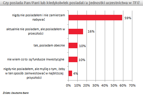Jak pokazuje badanie opinii przeprowadzone przez Deutsche Bank jedynie co dziesiąty Polak posiada obecnie jednostki uczestnictwa w funduszach inwestycyjnych, a 16% korzystało z tej formy inwestycji w przeszłości. Plany zakupu jednostek w ciągu najbliższych 12 miesięcy ma tylko ponad 4% badanych. Większość Polaków nie ma zamiaru inwestować w ten sposób, a 10% badanych nie wie, czym są fundusze. Wśród nich przeważają osoby młode w wieku 18-24 lata. Z drugiej strony o coraz większej popularności funduszy inwestycyjnych świadczą rosnące aktywa netto polskich TFI, które na koniec lipca wyniosły 199 mln zł.