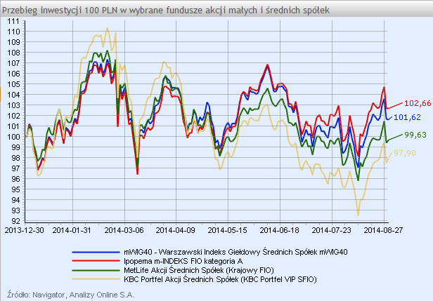 Jedynym funduszem, który od początku roku uzyskał dodatni wynik jest Ipopema m-INDEKS FIO. Jest to fundusz o charakterze indeksowego, zarządzający starają się odwzorowywać skład indeks u mWIG40. Jego portfel w całości składa się ze średnich spółek wchodzących w skład tego indeksu. Oznacza to, iż fundusz najlepiej sobie radzi wtedy, gdy mamy do czynienia z lepszym zachowaniem giełdowych średniaków, tak jak w tym roku. Jednak w czasie gdy na giełdzie królują giełdowe maluchy, fundusz ma niewielkie szanse na pokonanie konkurentów opartych na tym segmencie rynku. Warto zwrócić uwagę, iż jest to rozwiązanie dla zamożniejszych inwestorów, gotowych zainwestować minimum 200 tys. zł na początku.