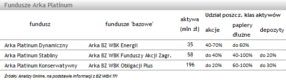 Aktywa największego funduszu z całej trójki - Arki BZ WBK Obligacji Plus, która od dziś funkcjonuje jako Arka Platinum Konserwatywny, dalej będą lokowane głównie w papiery dłużne, a udział akcji nie będzie mógł przekroczyć 20% (wcześniej było to 10%). W najbliższym czasie, w portfelu wciąż będą dominować obligacje naszego skarbu państwa, ponadto będą w nim inwestycje w fundusze zagraniczne z ekspozycja na obligacje korporacyjne. W przypadku dwóch pozostałych funduszy ograniczona została ekspozycja na rynek akcji.