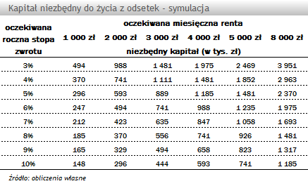 Jak dużo pieniędzy potrzebujemy na ten luksus? Na to pytanie każdy musi odpowiedzieć sobie sam. Różni ludzie mają bowiem różne potrzeby i wydatki. Dlatego też, aby ułatwić czytelnikom zgłębienie tematu, przyjęliśmy w obliczeniach szeroki zakres miesięcznej renty – od 1000 zł do 8000 zł. Założyliśmy również, że wykorzystujemy jedynie zysk (odsetki), nie naruszając zgromadzonego majątku.
