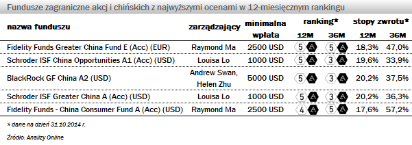 Większą ekspozycję na rynek chiński znajdziemy w ofercie zagranicznych instytucji. Obecnie inwestorzy mają do wyboru kilkanaście tego typu rozwiązań. Cztery z nich mogą się pochwalić najwyższą oceną - 5a w 12-miesięcznym rankingu. W tym gronie znajdziemy dwa rozwiązania zarządzane przez Schroders: Schroder ISF China Opportunities A1 (Acc) (USD)Schroder ISF Greater China A (Acc) (USD)