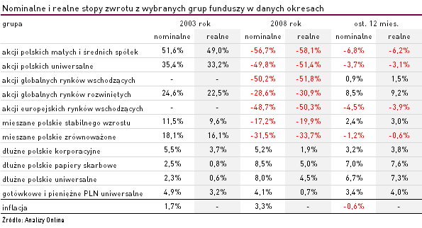 Po drugie, choć z perspektywy inwestora niższe nominalne stopy zwrotu oznaczają po prostu niższy zarobek, to w rzeczywistości nie musi być tak źle. Sprzymierzeńcem inwestorów może być bowiem inflacja, szczególnie wówczas gdy jest ona niska. Obecnie, realna stopa zwrotu (po uwzględnieniu inflacji) różnych grup funduszy nierzadko jest wyższa od tej z przeszłości. Z danych opublikowanych przez GUS wynika, że dynamika cen towarów i usług na przestrzeni ostatnich 12 miesięcy wyniosła -0,6%. To oznacza, że realna stopa zwrotu z poszczególnych funduszy jest wręcz wyższa od nominalnej. Dla przykładu, w ciągu 12 miesięcy, do końca października br. fundusze pieniężne wypracowały przeciętnie +3,39% stopę zwrotu. Po uwzględnieniu inflacji, realny zysk wyniósł +4,0%. Z kolei w 2008 roku, mimo iż nominalnie zarobiły więcej (średnio +4,1%), to w środowisku wysokiej inflacji, która wynosiła wówczas 3,3%, realny zysk był znacznie niższy i wyniósł +0,7%.