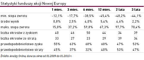 Należą one też do grona najbardziej ryzykownych rozwiązań w ofercie TFI. Większość przedstawicieli tej grupy otrzymało notę 6 w 7-stopniowej skali KIID, opisującej profil ryzyka. Zmienność wyników funduszy akcji Nowej Europy jest bardzo wysoka. Potrafią one dużo zyskać i dużo stracić w krótkim okresie. W ciągu ostatnich 5 lat, miesięczne średnie stopy zwrotu funduszy akcji Nowej Europy wahały się od -12,1% do +15,0%, a odsetek miesięcy zakończonych stratą wyniósł 45%. Jest to więc oferta dla osób o wysokiej skłonności do ryzyka lub tych, które szukają dynamicznego produktu do uzupełnienia zróżnicowanego portfela inwestycyjnego.