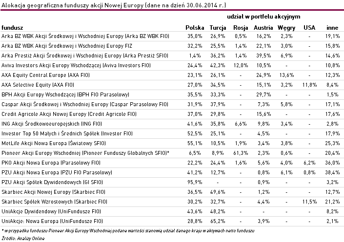 W ciągu ostatnich 5 lat kalendarzowych różnica między najwyższym a najniższym wynikiem w tej grupie wynosiła nawet 70 pkt proc. Tę sytuację dobrze obrazuje miniony rok. Kilka funduszy akcji Nowej Europy - AXA Selective Equity (AXA FIO), ING Akcji Środkowoeuropejskich (ING FIO), UniAkcje: Nowa Europa (UniFundusze FIO) oraz UniAkcje Dywidendowy (UniFundusze FIO) zyskało w tym czasie ponad +15,0%. Było to możliwe dzięki wysokiej na tle konkurencji alokacji w akcjach tureckich. W przypadku funduszy AXA Selective Equity (AXA FIO) i Skarbiec Spółek Wzrostowych (Skarbiec FIO) wynikom sprzyjały też inwestycje w USA. Z kolei duży udział rosyjskich spółek (ponad 60,0% aktywów netto na koniec czerwca 2014 r.) mógł zadecydować o ponad -25,0% stracie funduszu Pioneer Akcji Europy Wschodniej.