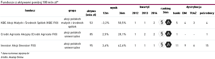 Spośród 58 funduszy akcyjnych skierowanych do szerokiego grona odbiorców (akcji polskich uniwersalnych oraz akcji polskich małych i średnich spółek), jedynie 5 regularnie kończyło ostatnie 3 lata w pierwszym lub drugim kwartylu stóp zwrotu. Aż 3 z nich należą do mało popularnych rozwiązań, których aktywa nie przekraczają 100 mln zł.