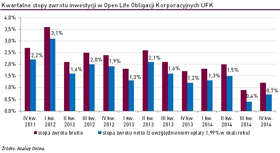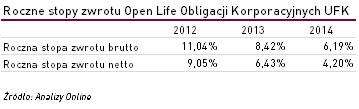 Drugą stroną związaną z ryzykiem jest wynagrodzenie jakie otrzymują inwestorzy. Wycena jednostki UFK publikowana przez Open Life TUŻ niezależnie od okresu wygląda bardzo atrakcyjnie. Od początku istnienia (koniec września 2011) jej wartość wzrosła o ponad +32,3%. Koniecznie należy jednak wziąć pod uwagę, że publikowane wyceny nie uwzględniają inkasowanej przez towarzystwo opłaty za zarządzanie sięgającej nawet 1,99% w skali roku. Jest ona pobierana przez umorzenie odpowiedniej liczby udziałów jednostkowych na rachunku klienta, przez co pomniejsza ostateczną stopę zwrotu jego inwestycji. Jednak nawet z uwzględnieniem sumarycznego kosztu zarządzania, od rozpoczęcia działalności Open Life Obligacji Korporacyjnych UFK dystansuje najbardziej zyskownych konkurentów z grona otwartych funduszy inwestycyjnych długu korporacyjnego. W horyzoncie blisko 3,5 roku jego przewaga wynosi ok. +3,4 pkt proc. Warto jednak zwrócić uwagę na systematyczne spadki stóp zwrotu w kolejnych latach kalendarzowych. O ile w roku 2011 zyski przekroczyły +11,0%, o tyle w minionym było to już „tylko” ok. +6,2% (obie wartości przed odjęciem kosztów). Taki scenariusz jest jednak w znacznej mierze efektem spadku rynkowych stawek WIBOR, choć częściowo można też przypisywać go mniejszej elastyczności portfela wynikającej z dynamicznie rosnących aktywów.