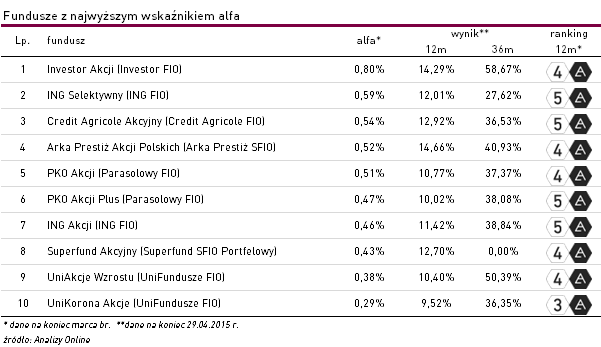 Według danych na koniec marca, najwyższym poziomem wskaźnika alfa charakteryzuje się Investor Akcji (Investor FIO), tegoroczny laureat nagrody Alfa 2014 w kategorii najlepszy fundusz akcji o uniwersalnej strategii. Warto jednocześnie zauważyć, że fundusz ten może pochwalić się najwyższą miarą tego wskaźnika nie tylko w okresie ostatnich 12 miesięcy, lecz także w 3-letnim horyzoncie. Zgodnie z filozofią inwestycyjną, zarządzający Investor Akcji (Investor FIO) Maciej Chudzik, w doborze spółek do portfela, kieruje się przede wszystkim wspomnianą selekcją opartą w dużej mierze na analizie fundamentalnej oraz na analizie trendów rynkowych. Skład portfela funduszu w dużym stopniu odbiega od benchmarku opartego o indeks WIG. (przeczytaj : Ciekawy pomysł na rynek akcji). Jak pokazują wyniki funduszu, takie podejście sprawdza się już od dłuższego czasu, a Investor Akcji (Investor FIO), jako jedyny fundusz akcji polskich uniwersalnych w okresie ostatnich 3 lat regularnie plasował się w pierwszym kwartylu rocznych stóp zwrotu.
