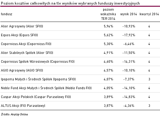 Pod względem wskaźnika TER obrazującego relację całkowitych kosztów w danym roku do średniorocznej wartości aktywów, najdroższym funduszem akcji polskich w 2014 r. okazał się Alior Agresywny (Alior SFIO). W jego przypadku koszty obciążyły aktywa aż w 5,94%. Również w poprzednich latach koszty te były bardzo wysokie. Podobnie wygląda sytuacja w Alior Stabilnych Spółek (Alior SFIO).