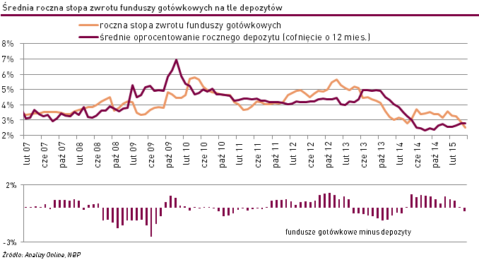 Pomimo otoczenia niskich stóp procentowych, fundusze gotówkowe i pieniężne wciąż pozostają najpopularniejszą grupą funduszy, do której w okresie ostatnich 12 miesięcy napłynęło prawie +6,3 mld zł. Łącznie aktywa tej najbezpieczniejszej grupy funduszy wynoszą już niespełna 32 mld zł czyli 27,9% całego krajowego rynku funduszy inwestycyjnych. Jednak kwota ta w porównaniu ze środkami zgromadzonymi na lokatach bankowych jest znikoma. Bowiem to właśnie depozyty od lat są głównym miejscem gromadzenia oszczędności.