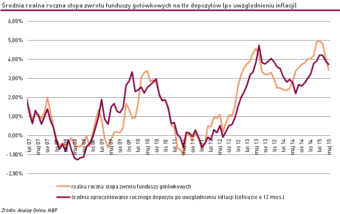 Od maja 2014 r. do kwietnia br. wyższe stopy zwrotu przynosiły fundusze gotówkowe. Sytuacja ta uległa zmianie dopiero w zeszłym miesiącu. W ostatnim czasie na wyniki funduszy pieniężnych i gotówkowych niekorzystnie wpływa podwyższona zmienność na rynku obligacji skarbowych. W efekcie w kwietniu roczna stopa zwrotu funduszy gotówkowych i pieniężnych (przesuwana co miesiąc) spadła poniżej poziomu +3%, zatrzymując się na koniec maja br. na poziomie +2,52%. W efekcie, po raz pierwszy od 12 miesięcy, lepiej wypadają depozyty. Według danych na koniec maja jedynie 30% funduszy zdołało wypracować wyższy zysk w porównaniu ze średnim oprocentowaniem lokaty.