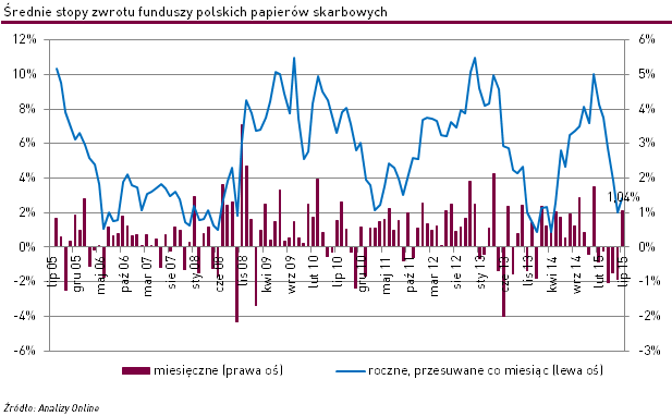 W lipcu średnia stopa zwrotu w przypadku funduszy o uniwersalnej strategii wyniosła +0,8%, a polskich papierów skarbowych przekroczyła +1,0%. W przypadku 5 rozwiązań przekroczyła nawet +1,5%: Amundi Obligacji (Amundi Parasolowy FIO), BNP Paribas Papierów Dłużnych (BNP Paribas FIO), Noble Fund Obligacji (Noble Funds FIO) oraz debiutanta - Ipopema Dłużny (Ipopema SFIO). Choć licząc od początku roku średni wynik pozostaje ujemny, to roczna stopa zwrotu wzrosła do +2,81%.