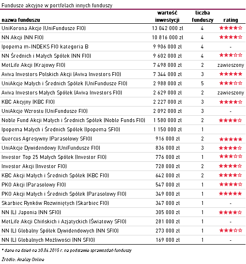 W gronie najchętniej wybieranych funduszy akcyjnych wyróżnił się natomiast UniKorona Akcje (UniFundusze FIO) wybrany przez 4 zarządzających, którzy na koniec I półrocza 2015 r. zainwestowali w jego jednostki ponad 13,0 mln zł. Rozwiązanie z ponad 18-letnim stażem na rynku docenili eksperci NN Investment Partners TFI, Skarbiec TFI oraz BM BGŻ. Jest to jeden z solidnych funduszy akcyjnych, oceniony przez naszych analityków na 4 gwiazdki w Ratingu Analiz Online.