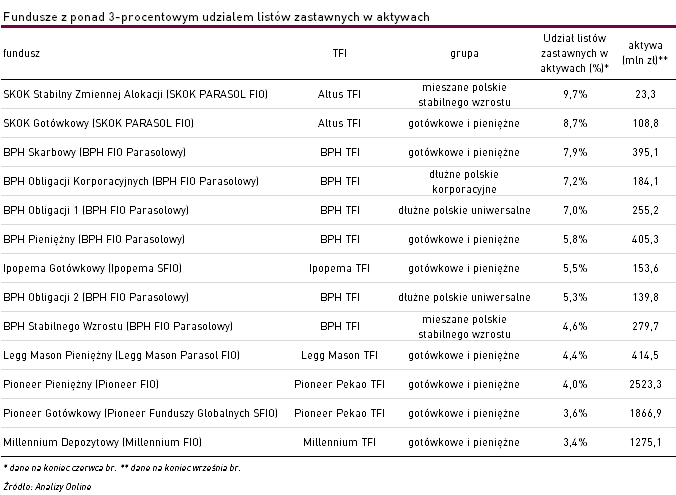 Według danych z ostatnich sprawozdań finansowych listy zastawne znajdują się w portfelach 21 detalicznych funduszy inwestycyjnych pochodzących z 11 różnych TFI. Najbardziej aktywne w tym obszarze jest BPH TFI. Znajdziemy je w portfelach 7 funduszy, a w 6 przypadkach ich udział przekracza 5% aktywów. Dużą wagę do tego typu instrumentów przypisują także zarządzający SKOK Stabilny Zmiennej Alokacji (SKOK PARASOL FIO) (9,7%) oraz SKOK Gotówkowy (SKOK PARASOL FIO) (8,7%). Pod względem wartości zaangażowanych środków na rynku przoduje jednak Pioneer Pekao TFI, którego zarządzający ulokowali w listach zastawnych blisko 180 mln zł. Na koniec czerwca br. znajdowały się one w portfelach: Pioneer Pieniężny (Pioneer FIO), Pioneer Pieniężny Plus (Pioneer FIO) i Pioneer Gotówkowy (Pioneer Funduszy Globalnych SFIO). Jednak w żadnym z produktów nie przekraczały 5% aktywów.
