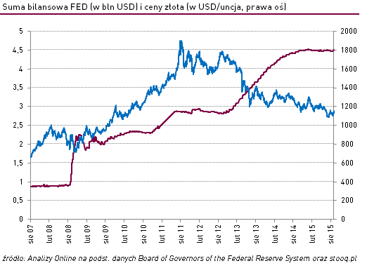 Idąc dalej w swoich rozważaniach Rafał Matulewicz poddał pod wątpliwość też to, czy na pewno białe jest białe, a czarne jest czarne. Spoglądając na wykres S&P500 od początku 2009 r. możemy obserwować pozornie niekwestionowany, byczy sentyment inwestorów. Sęk w tym, że niekoniecznie wyrażony jest on we właściwej walucie. Miarodajność dolara może „podkopywać” jego gigantyczny dodruk, o czym dobrze świadczy skala wzrostu sumy bilansowej FED. Rezerwa Federalna „wpompowuje” pieniądz w gospodarkę skupując aktywa z rynku, przez co puchnie jej bilans (patrz wykres poniżej). Jako alternatywnej waluty dyrektor w PKO TFI proponuje użyć surowca, na którego podaż banki centralne nie mają wpływu – tj. złota. Jako że od II poł. 2012 r. jest ono w trendzie spadkowym, wyrażony w tej jednostce kurs S&P500 również reprezentowałby od kilku lat rynek niedźwiedzia.