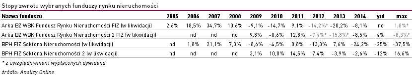 Arka Fundusz Rynku Nieruchomości FIZ jest w likwidacji od czerwca 2014 r. Do tego grona w ostatnim tygodniu grudnia 2015 roku dołączyły również inne fundusze: trzeci pod względem stażu rynkowego tj. BPH Sektora Nieruchomości FIZ, BPH Sektora Nieruchomości 2 FIZ oraz Arka Fundusz Rynku Nieruchomości 2 FIZ. We wszystkich przypadkach powodem likwidacji jest upłynięcie okresu na jaki były utworzone.