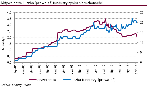 Początkowy okres i tak nadal młodego rynku funduszy nieruchomości w Polsce należał do lat tłustych. Dynamicznie rozrastała się zarówno oferta, jak i aktywa ulokowane w produktach z tego segmentu. Szczyt formy nastąpił w 2008 r., kiedy to pojawiło się aż 6 nowych funduszy obok wcześniejszych 8. Wartość aktywów osiągnęła na koniec roku ok. 2,5 mld zł. To również na ten okres przypadają rekordowe napływy – w lipcu 2008 r. sięgnęły one blisko +600 mln zł, co jak dotąd się już nie powtórzyło. Kolejne 2 lata, podczas których odczuwalna była transmisja kryzysu hipotecznego z USA do Europy upłynęły raczej pod znakiem stagnacji. Poprawa nastąpiła w 2011 r., a najwyższa wartość aktywów zgromadzonych przez fundusze nieruchomości przypadała na koniec 2012 r. (3,5 mld zł). Od tego czasu przez ostatnie 2 lata wartość środków spadła do 2 mld zł, mimo, że kolejne TFI uruchamiają fundusze tego typu - ich liczba obejmuje (na koniec listopada) 20 produktów.
