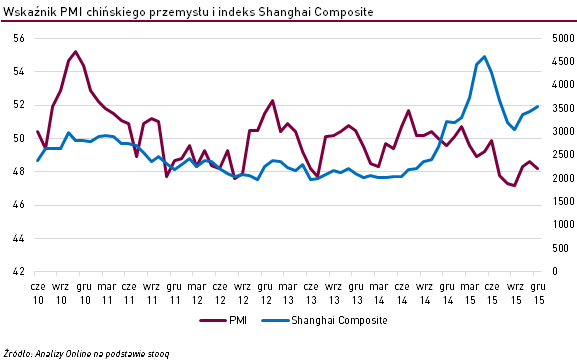 Impulsem do takich reakcji była publikacja liczonego przez Markit Economics wskaźnika PMI dla chińskiego przemysłu. Wbrew nadziejom analityków na wzrost do 49 punktów, jego wartość obniżyła się w grudniu z 48,6 do 48,2 punktu. Zaskoczenie, przynajmniej dla chińskich inwestorów, było tym większe, że analogiczny wskaźnik zaprezentowany przez Chińską Federację Logistyki i Zaopatrzenia (CFLP) 1 stycznia 2016 r. sygnalizował niewielką zwyżkę z 49,6 do 49,7 punktu.