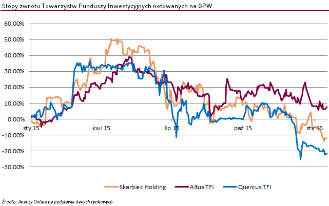 Słaba koniunktura na warszawskim parkiecie odbija się negatywnie na kursach notowanych na giełdzie TFI. Od maja ich akcje straciły -40,0%. Zyski towarzystw zależą przede wszystkim od przychodów z opłaty za zarządzanie, które w dużej mierze zależą od wielkości aktywów zgromadzonych w funduszach oraz wyników przez nie osiąganych. Na rynku spadkowym bardzo trudno o przyrost obydwu tych wielkości. Potwierdzają to wyniki TFI osiągnięte w trzecim kwartale(spadek o ok. jedną czwartą). Wyjątkiem jest Altus TFI, które odnotowało wzrost zysku netto o ponad +50%. Było to spowodowane między innymi przejęciem SKOK TFI (o którym pisaliśmy w materiale „Altus TFI przejmuje konkurencyjne TFI”). Tak dynamiczny rozwój znalazł odzwierciedlenie w cenie akcji. Altus jako jedyny od początku 2015 r. odnotował dodatnią stopę zwrotu(+9,0%). Quercus TFI oraz Skarbiec TFI w tym samym okresie osiągnęły ponad -10,0% straty.