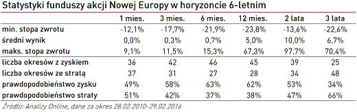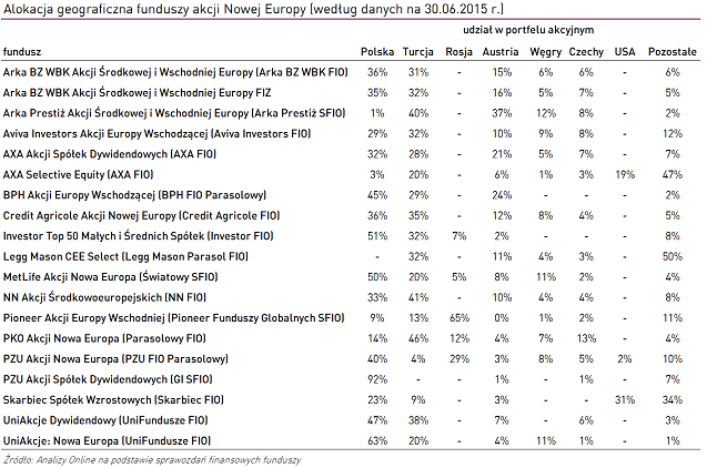 To właśnie one w dużej mierze zaważyły na złych wynikach grupy w ostatnim roku. Gdy w całym 2015 r. turecki BIST100 spadł o ponad -16%, a WIG20 o -20%, trudno oczekiwać spektakularnych stóp zwrotu. Patrząc na ostatnie 12 miesięcy (licząc od końca lutego) prawie wszystkie fundusze akcji Nowej Europy znalazły się pod kreską. Wyjątkiem był PZU Akcji Spółek Dywidendowych (+11,3%), który według ostatnich dostępnych sprawozdań przeszło 90% portfela akcyjnego ulokowane miał na GPW. Dobry wynik to m.in. zasługa dużego udziału spółek spoza indeksu blue chipów. Reszta funduszy wypadła znacznie gorzej. Wynikom nie sprzyjał duży udział akcji tureckich np. w NN Akcji Środkowoeuropejskich i UniAkcje Dywidendowy, które odnotowały ponad -12% straty. Dodatkowo, ryzyko walutowe w tych produktach nie jest zabezpieczane, co wpłynęło na pogłębienie strat wraz z spadkiem notowań tureckich spółek. Produkty z ekspozycją na inne gospodarki Europy Środkowo-Wschodniej również notowały słabe wyniki. Mocno traciły PZU Akcji Nowa Europa (-13,4%) oraz Pioneer Akcji Europy Wschodniej (-14,5%), których portfele są w dużym stopniu wyeksponowane na gospodarkę Rosji.