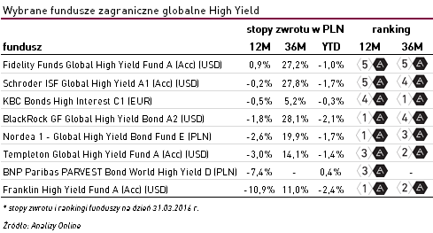 Inwestorzy zainteresowani lokatą kapitału w papierach wysokodochodowych mogą skorzystać m.in. z funduszy zagranicznych globalnych high yield, dostępnych na polskim rynku. Ich aktywa składają się głównie z obligacji emitowanych przez firmy amerykańskie oraz te działające w Europie Zachodniej. W portfelach pojawiają się również emisje spółek z innych państw na całym świecie.
