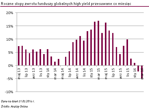 Obrazują to średnie wyniki rozwiązań zagranicznych globalnych high yield. Ich 12-miesięczne stopy zwrotu w PLN w ciągu ostatnich 3 lat wahały się od -5,0% do +17,0%. Koniunktura na rynku obligacji wysokodochodowych nie rozpieszczała inwestorów w 2015 r. Spadające ceny ropy naftowej, niekorzystne z punktu widzenia firm energetycznych i wydobywczych, ryzyka gospodarcze (w tym spowolnienie w Chinach) oraz oczekiwanie na cykl podwyżek stóp w USA to tylko niektóre z argumentów zniechęcających inwestorów do papierów high yield. Od połowy lutego mieliśmy natomiast do czynienia z odbiciem na tym rynku.