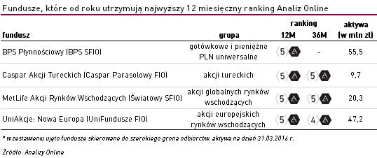 W ostatnim, marcowym Rankingu Analiz Online nadaliśmy oceny 328 funduszom w 12-miesięcznym horyzoncie. 55 z nich wykazało się na tyle wysoką efektywnością w rocznym horyzoncie, że otrzymało najwyższą notę 5a. Znacznie mniej jest jednak funduszy, które były w stanie meldować się w czołówce Rankingu regularnie, miesiąc po miesiącu. Obecnie znajdziemy jedynie 4 rozwiązania, dostępne dla szerokiego grona odbiorców, którym udało się utrzymać na szczycie przez co najmniej 12 miesięcy (w krótkim, rocznym horyzoncie).