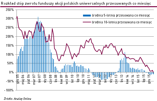 Wszystko jednak wskazuje na to, że w najbliższych miesiącach również i ta granica zostanie złamana. Na koniec kwietnia 10-letnia średnia stopa zwrotu funduszy akcji polskich uniwersalnych wyniosła zaledwie +0,74%. To najniższy poziom w historii! W przeszłości nierzadko zdarzało się, że 10-letni przeciętny wynik znacznie przekraczał +100%, a inwestor, który zdecydował się na fundusz akcji polskich pod koniec 1995 roku w 10 lat zarobił nawet ponad +300%.