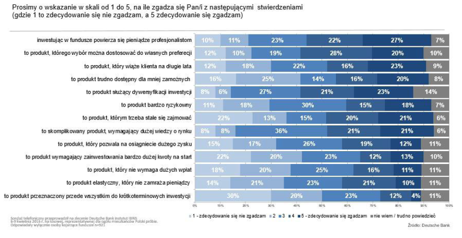 Tak uważa 22% ankietowanych, a kolejne niemal 27% zgadza się z tą opinią w sposób zdecydowany. Przeciwnego zdania jest 21% respondentów. – Na nasze zyski w TFI pracuje zespół doświadczonych i kompetentnych zarządzających, którzy kupują, sprzedają i monitorują inwestycje, korzystając przy tym ze swej wiedzy i doświadczenia – mówi Monika Szlosek. Warto pamiętać, że zarówno zarządzający, jak i doradcy inwestycyjni są zobowiązani zdać egzamin nadzorowany przez Komisję Nadzoru Finansowego.