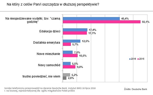 Liczba osób, które udzieliły tej odpowiedzi, zmniejszyła się jednak w porównaniu z badaniem sprzed roku. O ile w 2015 r. ponad połowa ankietowanych (55%) deklarowała chęć posiadania środków na niespodziewane wydatki, o tyle w tym roku już tylko 40% oszczędza na czarną godzinę.