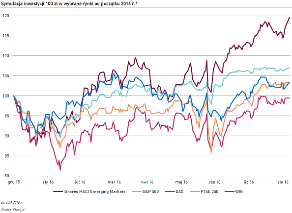 Tylko w tym roku akcje globalnych rynków wschodzących rosną już o kilkanaście procent. W związku z licznymi wydarzeniami, które dotknęły zwłaszcza dojrzałe gospodarki - brytyjskie referendum, zwlekanie Rezerwy Federalnej w sprawie podwyżki stóp procentowych, Emerging Markets daleko w tyle zostawiły tamtejsze giełdy: amerykańską (+7%), brytyjską (+3,3%) czy niemiecką (-0,5%).