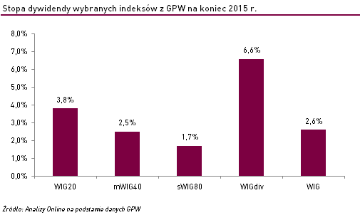 Pod tym względem dobrze wyglądają statystyki warszawskich indeksów. Stopa dywidendy wskaźnika WIGdiv (obejmującego 30 największych spółek dzielących się zyskiem) na koniec 2015 r. wyniosła 6,6%. W przypadku indeksu szerokiego rynku WIG znajdowała się na poziomie 2,6%. Warto przypomnieć, że w tym roku średnie oprocentowanie depozytów wahało się od 1,7% do 1,8%.