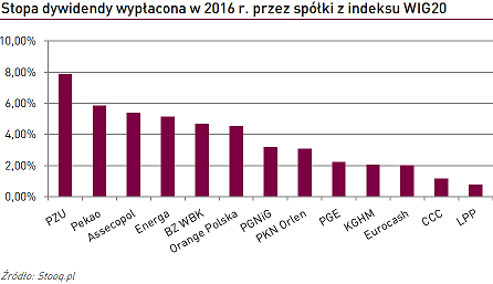 Wśród największych polskich spółek najwyższą stopę dywidendy w 2016 wypłacił PZU. 29 września akcjonariusze otrzymali 2,08 zł na akcję. Stopa dywidendy wyniosła 7,88%.