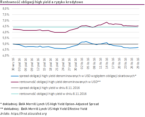 Drugim czynnikiem o istotnym znaczeniu jest ryzyko kredytowe. Tutaj obniżka podatków czy wzrost nakładów na infrastrukturę zapowiadane przez nową władzę (pomijając inne aspekty wyborczych obietnic), mogą być interpretowane na korzyść przedsiębiorstw, bo łączą się z lepszymi perspektywami ich biznesów. Powinny więc oznaczać spadek ryzyka kredytowego, a więc wpływać na wzrost cen papierów korporacyjnych. Jak pogodzić to z faktem, że po wyborze nowego prezydenta USA, notowania obligacji korporacyjnych o najwyższym ryzyku (tzw. high yield) spadły, a nie wzrosły?