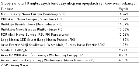 W zestawieniu najlepiej wypadł MetLife Akcji Nowa Europa (Światowy SFIO), którego stopa wzrostu wyniosła blisko +17%. Jak zaznaczali nasi analitycy, fundusz zyskał przede wszystkim dzięki znacznemu udziałowi spółek rosyjskich w portfelu (ponad 15%), który jest jednym z najwyższych w całej grupie. Co więcej, ponad 30% kapitału ulokowane jest w spółkach polskich, a aż 27% akcji w spółkach tureckich. Niemal równomierne rozłożenie aktywów między tymi dwoma rynkami pozwoliło zbilansować straty poniesione na skutek inwestycji w papiery notowane nad Bosforem. Jeżeli chodzi o państwa regionu Europy Środkowo-Wschodniej, fundusz angażuje się w akcje węgierskie oraz czeskie, jednak ich udział w portfelu jest raczej skromny (odpowiednio 6% i 2%).