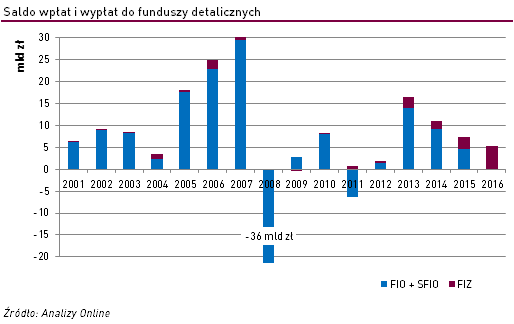 Jednak w ostatnich latach także rozwiązania oferowane szerszemu gronu zaczęły zdobywać rynek. Na koniec 2016 roku aktywa zgromadzone w detalicznych FIZ-ach warte były blisko 22 mld zł, ponad dwukrotnie więcej niż jeszcze 3 lata temu. W tym czasie ich udział w rynku detalicznym wzrósł z 10% do 16%. To głównie zasługa napływu nowych środków. Od 3 lat z roku na rok obserwujemy rosnące saldo wpłat i wypłat. W 2016 roku pozyskały one +5,2 mld zł netto, podczas gdy z funduszy otwartych klienci wypłacili ponad -0,2 mld zł.