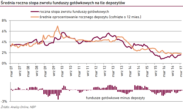Z drugiej strony, jak widać na poniższym wykresie, stopa zwrotu z funduszy gotówkowych i pieniężnych nie zawsze jest niższa od średniego oprocentowania lokat.