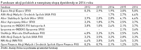 Dywidendy wypłacane przez spółki są jednym ze źródeł przychodów funduszy inwestycyjnych. Powiększają one wartość zarządzanych aktywów, odpowiednio zwiększając wartość jednostek uczestnictwa. Wg danych Analiz Online w całym 2016 roku fundusze krajowych TFI pozyskały w ten sposób 0,8 mld zł. To nieco mniej niż rok wcześniej, kiedy wyniosły blisko 0,9 mld zł.