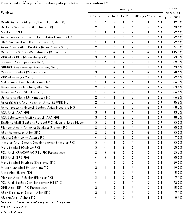 Liderem naszego zestawienia jest Credit Agricole Akcyjny, który może się pochwalić średnią z kwartyli rocznych stóp zwrotu na poziomie 1,3 w okresie ostatnich ponad pięciu lat (od 2012 do czerwca 2017). Za jego wyniki odpowiedzialny jest obecnie Jakub Płotka, który w lipcu ubiegłego roku zastąpił na stanowisku zarządzającego Szymona Borawskiego - Reksa. Jednostki funduszu mogą nabyć wyłącznie klienci banku Credit Agricole, co siłą rzeczy sprawia, że aktywa są niskie na tle konkurencji (67 mln zł w maju ‘17). To z kolei pozwala na większą elastyczność zarządzania – np. zarządzający może skorzystać z potencjału mniejszych spółek i zająć na nich odpowiednią pozycję, co w przypadku znacznie większych funduszy często nie jest możliwe. Na korzyść Credit Agricole Akcyjny gra również niższa na tle konkurencji opłata za zarządzanie – 2,95%, co w długim terminie ma duże znaczenie.