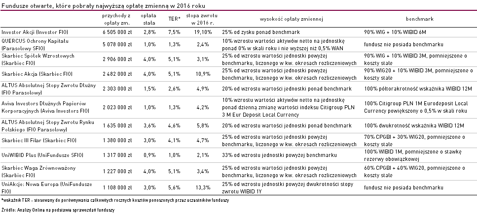 Do TFI, które najwięcej zarabiają na tej opłacie, można należą m.in. Altus TFI, Quercus TFI, Skarbiec TFI, ale także Investors TFI. Spójrzmy na listę funduszy, które na opłacie zmiennej zarobiły w zeszłym roku ponad 1 mln zł.