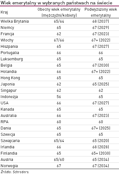 Z badania Schroders wynika, że trend podnoszenia wieku emerytalnego jest powszechny. Wiele krajów wprowadza regulacje opóźniające moment przejścia na emeryturę, głównie dla kobiet. Tabela poniżej pokazuje obecne i planowane poziomy wieku emerytalnego – moment, w którym osoba zaczyna korzystać z benefitów państwowych – w państwach na całym świecie.