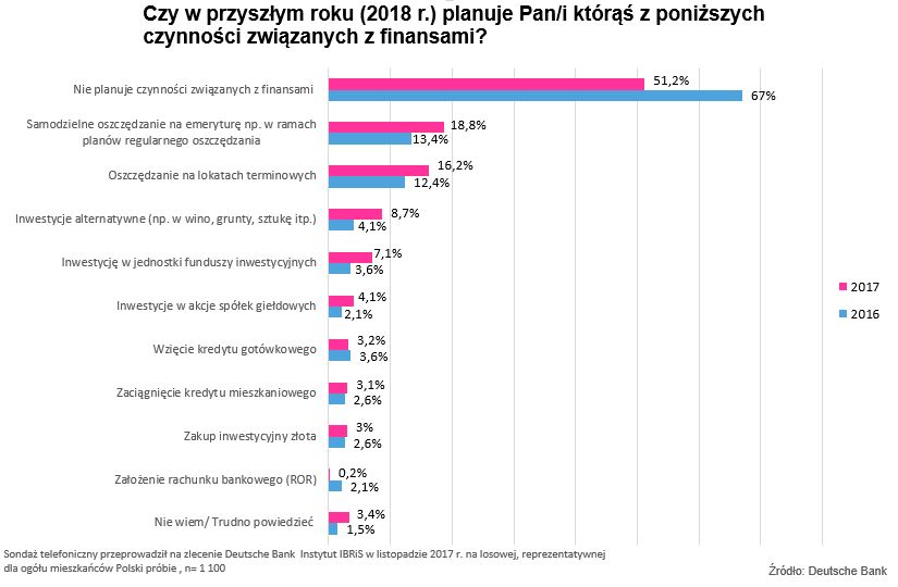 Przeprowadzony sondaż pokazuje, że prawie co drugi Polak ma plany związane z finansami na 2018 r. I co szczególnie budujące, liczba ta wzrosła rok do roku o prawie 16 p.p. Jak komentuje Monika Szlosek, Dyrektor Bankowości Detalicznej i Inwestycyjnej Deutsche Bank, wynik badania oznacza, że z jednej strony odczuwamy poprawę w naszych portfelach i częściej jesteśmy w stanie myśleć z wyprzedzeniem o tym, co zrobić z oszczędnościami, nie wydając ich wyłącznie na bieżącą konsumpcję.