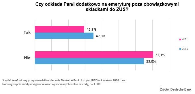 Z badania Deutsche Bank wynika, że 46% osób wykonujących wolny zawód (np. lekarzy, prawników, architektów) jest świadomych tego problemu i deklaruje samodzielne oszczędzanie na emeryturę, poza ZUS.