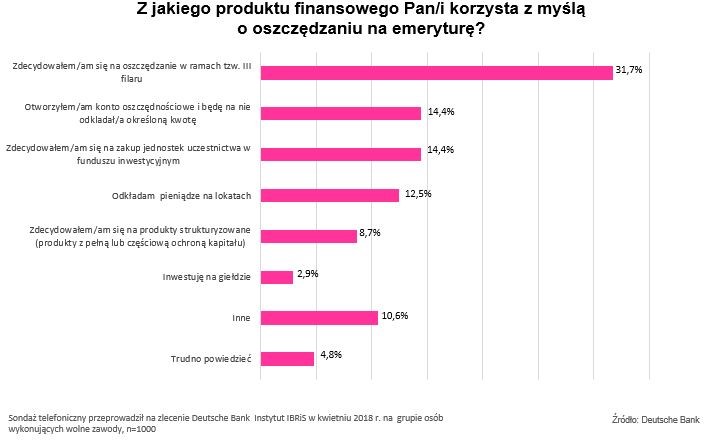 Wyniki badania pokazały w jaki sposób profesjonaliści odkładają na emeryturę. Okazuje się, że najpopularniejszym rozwiązaniem są IKE i IKZE – specjalne produkty dostępne w ramach tzw. III filara – w minionym roku posiadało je prawie jedna trzecia polskich specjalistów (31,7%).