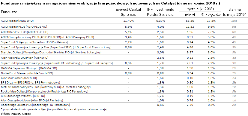 Na koniec 2018 roku obligacje IPF Investments o wartości 117 mln zł znajdowały się w portfelach 49 funduszy, a obligacje Everest Capital o wartości 60 mln zł posiadało 18 funduszy. Ponadto w portfelach 90 funduszy znajdowały się obligacje KRUK o wartości 559 mln zł.