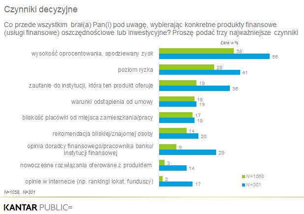 Decydując się na produkt inwestycyjny czy oszczędnościowy, Polacy przede wszystkim biorą pod uwagę wysokość oprocentowania, spodziewany zysk. W dalszej kolejności ważnym czynnikiem decyzyjnym jest poziom ryzyka produktu (28%). Czynniki decyzyjne wśród osób inwestycyjnych są podobne, dodatkowo jednak w procesie decyzyjnym ważną rolę spełnia doradca finansowy.