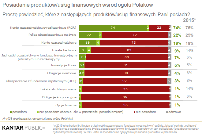 Poziom inwestowania wśród ogółu Polaków nie jest znaczący. Najczęściej posiadamy dość standardowe produkty finansowe. Większość (74%) ma rachunek bankowy, a co piąty Polak (22%) jest ubezpieczony na życie. Poza tym 9-19% Polaków oszczędza na koncie oszczędnościowym bądź lokacie. Produkty inwestycyjne bądź bardziej skomplikowane produkty finansowe posiadają nieliczni. Dodatkowo 5% badanych deklaruje, że inwestuje dodatkowo w inny sposób niż poprzez zakup produktów/usług finansowych. Jeśli już inwestujemy to najczęściej w nieruchomości oraz własną firmę.